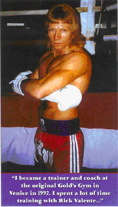 and steer away from new clients that are not really ready to make the changes in lifestyle and habits that are required to trigger real physical change." It is always difficult to turn away business, but at Rumble Boy, Rick is determined to work with only those individuals that will implement the systems and strategies that he's accumulated and passes along, based on 30 years of in-the-trenches work. "There are certain methods that flat out work and there are other methods that are a complete waste of time. So much of success, when it comes to improving athletic performance or improving a person's physique, relate to how hard and smart a person is willing to work. If a person commits to work hard, I can show them how to work smart." Rick's approach to martial arts runs contrary to the current craze of mixed martial arts. "I am a martial arts traditionalist. 1 still fight competitively both in Muay Thai and in classical boxing. 1 train fighters and have worked as a personal trainer for going on thirty years. I pass on a system that has a 1,000 year history and tradition." Rick's fight career carried him to the top of traditional Muay Thai: in his 36 fight career that spans thirty years, he has won state and national championships in full contact fighting. "I lived in Santa Monica and became immersed in the entire Southern California fighting, fitness and bodybuilding scene. I was fortunate |